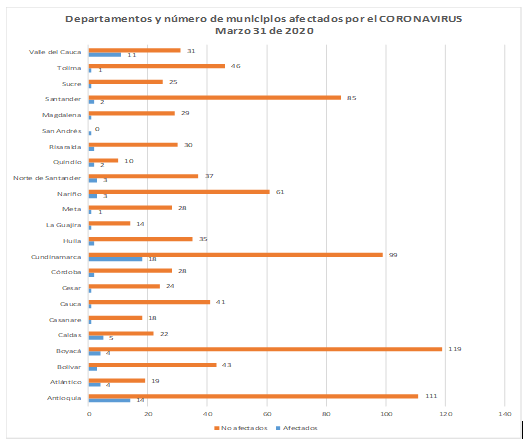 En Colombia hay 32 departamentos y hay casos de Coronavirus en 22 de ellos y se han presentado casos en 84 de los 1103 municipios. El 83% de los casos se presentan en las capitales de los departamentos afectados, el 72% en aquellas donde se han presentado 20 ó más casos (Bogotá, Cali, Medellín, Barranquilla, Cartagena, Pereira y Neiva), el 59% en las tres mayores (Bogotá, Medellín y Cali) y el 43% en Bogotá. Los otros 77 municipios afectados responden por el 17% de los casos.