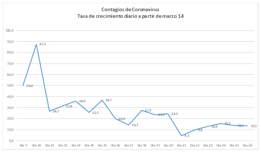 Hay indicios de que las medidas de contención están funcionando. La tasa de crecimiento diaria de los contagios ha caído fuertemente desde la aplicación de la cuarentena obligatoria. El promedio de las registradas entre el 14 y el 25 de marzo fue de 24%, mientras que entre el 27 y el 31 de marzo fue de 13%. Esto a pesar de que el número de pruebas se elevó considerablemente. Entre el 30 y el 31 de marzo los test aumentaron 27 %. Entre esas mismas fechas el porcentaje de los positivos del total de pruebas realizadas pasó de 6% a 5%.