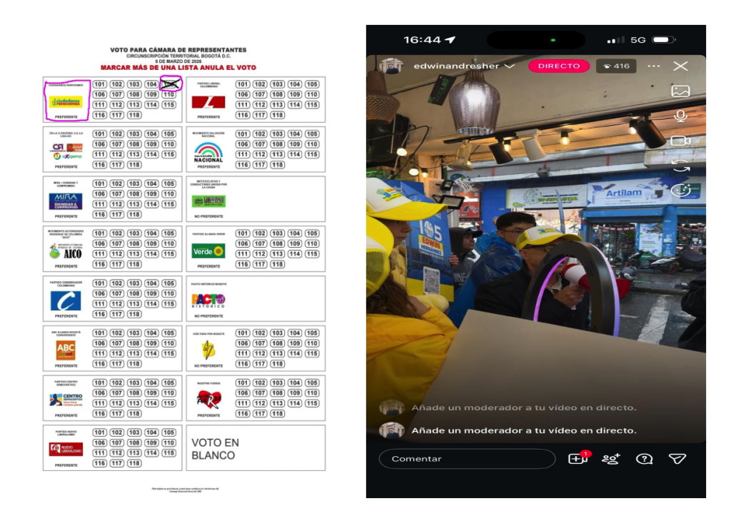 Tarjetón Cámara de Representantes Bogotá D.C. Opción #105 Edwin Hernández. Partido Ciudadanos Renovemos. A la derecha, actividad en la Zona Comercial de San Victorino, en actividad el 28 de enero de 2026. Foto: Edición del autor