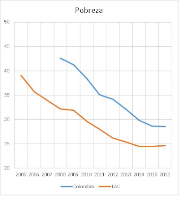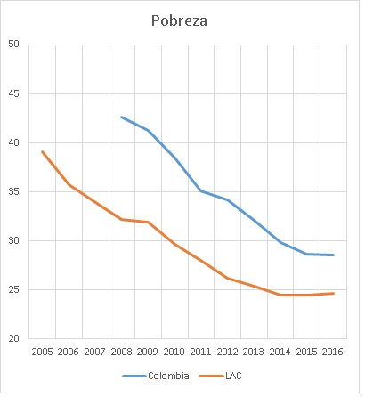 1. Pobreza: la tasa de pobreza, medida a partir de una línea comparable de 5,5 dólares por persona y por día, sigue siendo mayor en Colombia que en el promedio de América Latina y el Caribe (LAC). Pero la diferencia se ha cerrado de manera ostensible, pasó de 10 puntos en 2008 a 4 puntos en 2016.