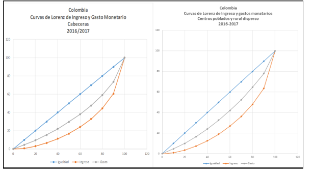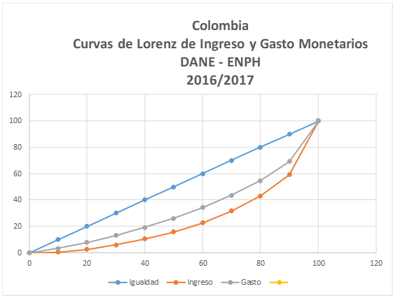 Cada diez años el DANE realiza la Encuesta Nacional de Presupuesto de los Hogares (ENPH) que tiene por objeto establecer los bienes y servicios que deben integrar la canasta de consumo que sirve para calcular las variaciones del Índice de Precios al Consumidor (IPC). La última ENPH es la realizada en 2016/17. Las distribuciones de ingreso y gasto monetarios que aquí se utilizan para construir las curvas de Lorenz y sus Ginis respectivos, son tomadas del Boletín Técnico del DANE[1]. La revisión de los rubros consumo incluidos en esta encuesta y en las de hace 10, 20 o más años daría una imagen espléndida de la impresionante diversificación de los bienes y servicios asequibles hoy a los colombianos. Aquí nos limitamos al aspecto puramente cuantitativo dejando para otra oportunidad el aspecto cualitativo, probablemente mucho más enriquecedor.