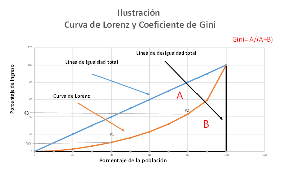 Mientras más se aleje la curva de Lorenz de la línea de distribución igualitaria y más se acerque a las líneas de desigualdad absoluta, mayor es la desigualdad de la distribución. En la gráfica esto lo representa el área marcada con la letra A. La relación de esta área con el área total del triángulo formado por las líneas de distribución igualitaria y de desigualdad absoluta es el coeficiente de Gini.