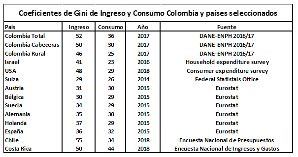Con sus Ginis de consumo de 2017, Colombia no luce mal frente a los países de nuestra pequeña muestra. Nos comparamos bien con Chile, y mucho mejor con Costa Rica, y no desmerecemos frente a los países desarrollados incluidos.