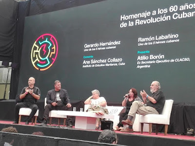 Mesa redonda en homenaje a los 60 años de la Revolución Cubana y a los 5 héroes luchadores antiterrotistas. En la foto con Gerardo Hernández, Ramón Labañino, Isabel Allende y Ana Sánchez Collazo.