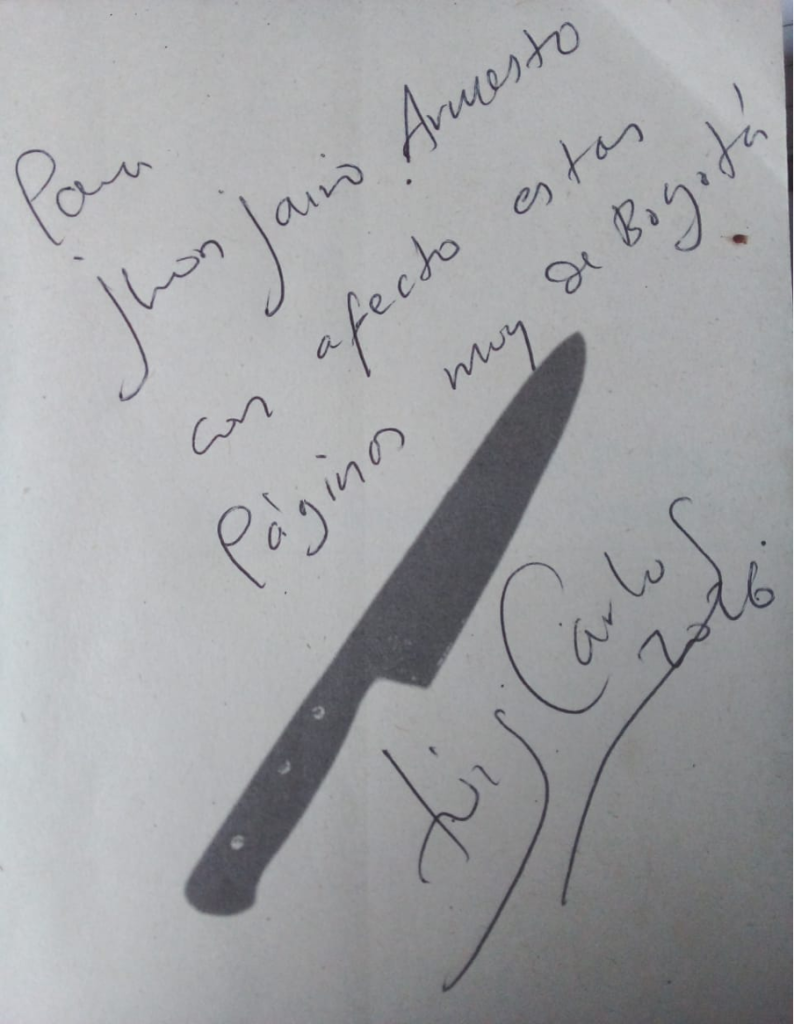 Firma del ejemplar obsequiado por  Luis Carlos Pulgarín Cabellos de su novela “Las Putas nunca mueren en domingo” (2022) a nuestro columnista Jhon Jairo Armesto Tren. Foto: cortesía del autor