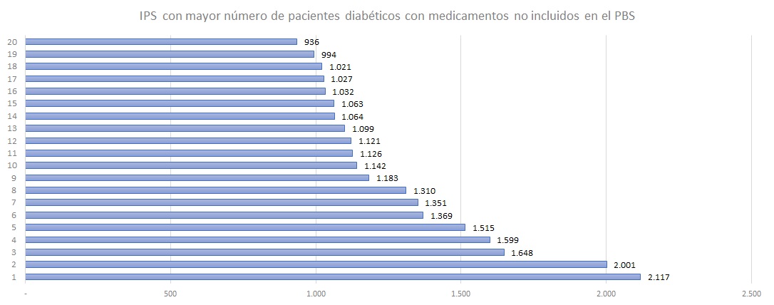 Un total de 2.113 IPS formularon medicamentos no incluidos en el plan de beneficios (PBS) a pacientes diabéticos: 10% de las IPS que más formularon concentran 66% de los pacientes. El gráfico siguiente muestra las 20 IPS con mayores pacientes. La IPS que aparece en primer lugar tiene una participación de 1,4% en el total de pacientes diabéticos con medicamentos no incluidos en el PBS. Las 20 primeras IPS tienen una participación cercana a 15,0%.
