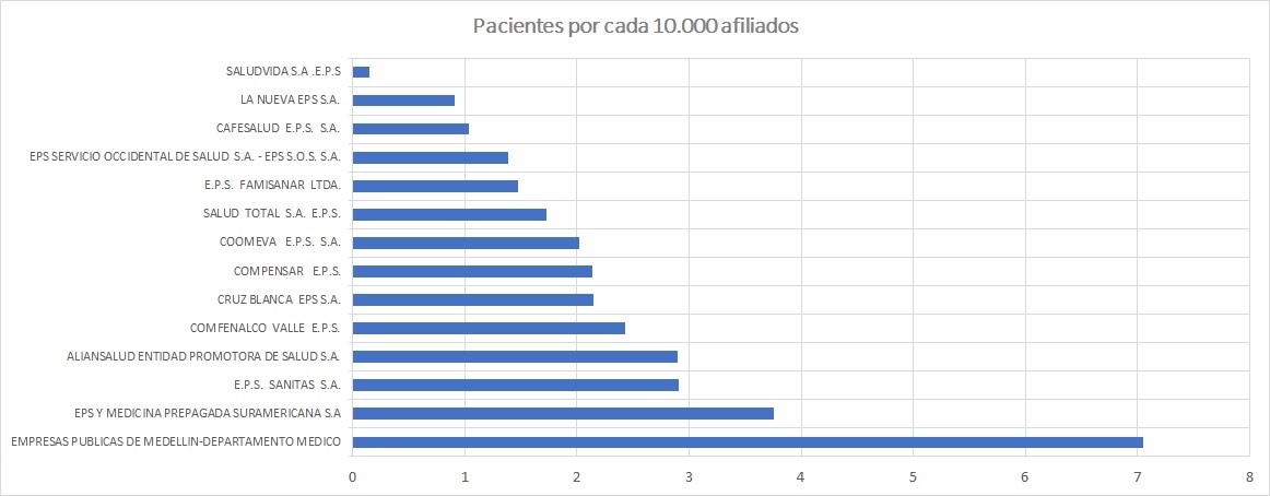 La distribución por EPS (medida como el número de pacientes con formulación por cada 10 mil afiliados) no es uniforme. La prescripción es tres veces más frecuente en EPS Sura, Sanitas y Aliansalud que en la Nueva EPS o SOS, por ejemplo. Estas diferencias pueden estar explicadas, a su vez, por diferencias en el comportamiento de los prescriptores asociados con las diferentes EPS.