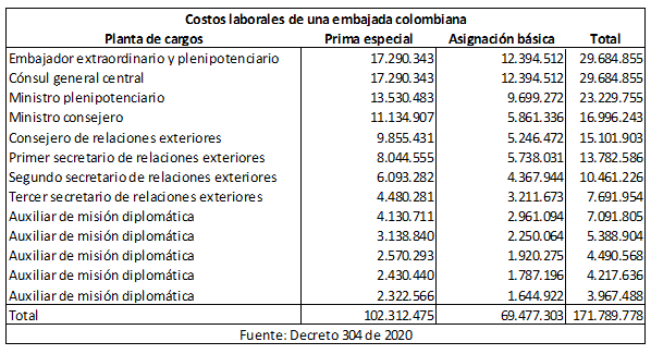 Colombia tiene relaciones diplomáticas con más de cien países y embajadas en unos sesenta. La tabla presenta los costos laborales de una embajada colombiana típica, se acuerdo con el Decreto 304 de 2020.