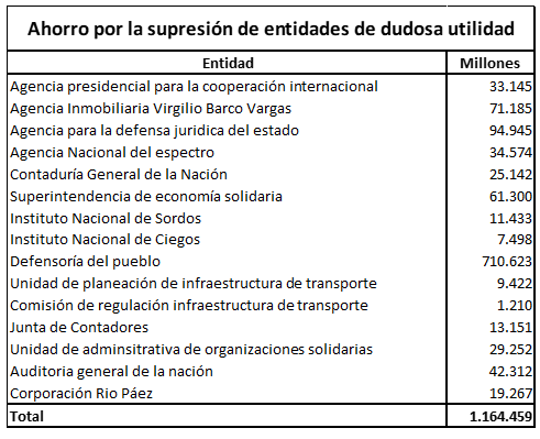 La tabla presenta los ahorros que se obtendrían con la supresión de las entidades de dudosa utilidad que se ha mencionado anteriormente. Pero seguramente está incompleto. Para ampliarlo bastaría con tomar el PGN y en la función “buscar” poner palabras como “agencia”, “unidad administrativa especial”, “Comisión”, “Corporación” y seguramente se encontrarán otros engendros burocráticos tan o más insólitos que los indicados.