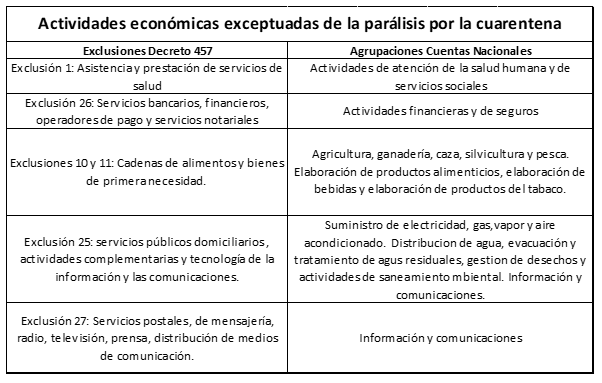 El decreto 457 presenta una lista de 34 exclusiones a la cuarentena. En algunos casos hay repeticiones: se continúa la prestación de servicios bancarios y financieros y se permite a la gente desplazarse para hacer uso de los mismos. Otras exclusiones guardan relación con dos o más agrupaciones de las cuentas nacionales como la referida a las cadenas de suministro de alimentos y bienes de primera necesidad o de productos médicos y farmacéuticos. También es difícil de aislar lo referente a la agrupación “Transporte y almacenamiento”, pues en las cuentas nacionales se desagrega por el modo de transporte y no por la naturaleza de lo transportado. La tabla presenta algunas correspondencias más evidentes pero que aun así no dejan de presentar problemas de identificación de las agrupaciones específicas que resultan afectadas.