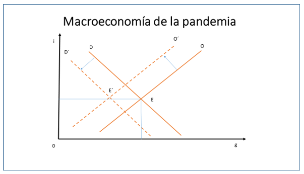 El viejo marco conceptual de oferta y demanda agregadas resulta bastante adecuado para explicar la situación. La gráfica muestra las curvas de oferta y demanda agregada de la macroeconomía básica. El eje vertical mide la tasa de inflación y el horizontal la tasa de crecimiento. Las líneas O y D, continuas, definen en el punto E la situación de la economía anterior choque del Covid-19. Las medidas de contención, por el cierre de empresas y negocios, desplazan, hacia arriba, la oferta agregada y, por la pérdida de ingresos, hacia abajo, la demanda. Las rectas, punteadas, O´y D´ definen en E´ la situación de la economía después del choque, con menos crecimiento y una inflación cuyo nivel es incierto pues dependerá de la fuerza relativa del choque inflacionista de oferta y del choque deflacionista de la demanda.