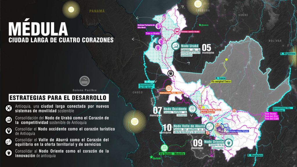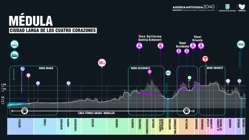 Médula, o la ciudad larga de cuatro corazones, una apuesta consignada en la Agenda Antioquia 2040, es un corredor de competitividad que nace en el Oriente antioqueño, a 2.200 metros sobre el nivel del mar. Desde allí desciende al Valle de Aburrá a través del Túnel de Oriente y, cruzando el Bitúnel Fernando Gómez Martínez —hoy conocido como Autopistas al Mar 1—, se abre paso hacia el valle del río Cauca en el Occidente antioqueño. Esta autopista, concesionada con participación de empresas españolas, austríacas y colombianas, fue financiada entre otros, por el Banco Nacional Alemán (KFW), el Instituto de crédito oficial de España (ICO), la CAF y la gran banca de Nueva York, (Black Rock)