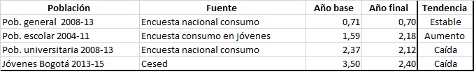 Se trata, en últimas, de interpretar la totalidad de la evidencia disponible. En mi opinión las cifras más relevantes son las de prevalencia de último año. Al respecto, hay cuatro parejas de datos comparables (ver abajo): dos muestran una caída, otro un aumento y otro más estabilidad. No hay una tendencia clara, discernible. No hay evidencia fuerte de disminución. Tampoco de aumento. Las cifras en conjunto sugieren una estabilidad en el consumo interno en el período en cuestión.